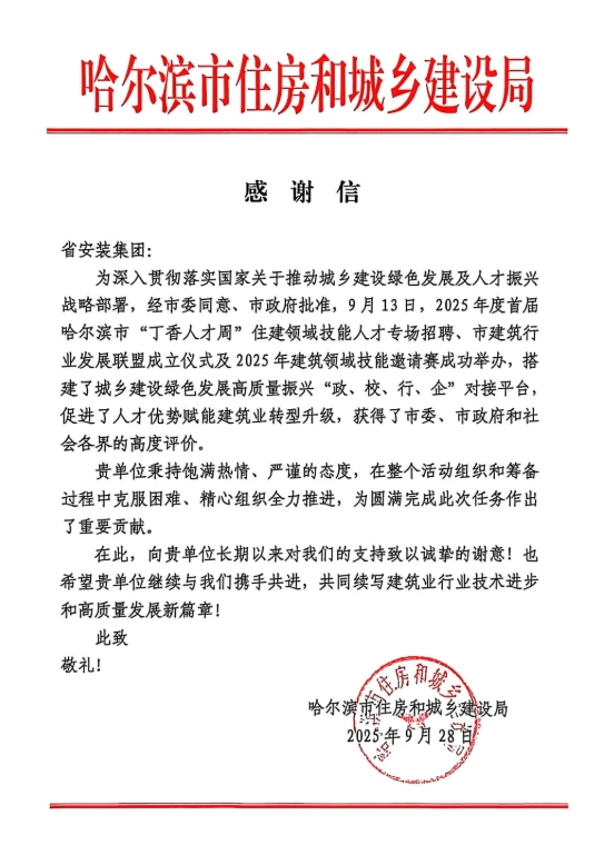 近日,颜射 收到哈尔滨市住房和城乡建设局发来的感谢信,信中对集团在2025年度首届哈尔滨市“丁香人才周”住建领域技能人才专场招聘、市建筑行业发展联盟成立仪式及2025年...