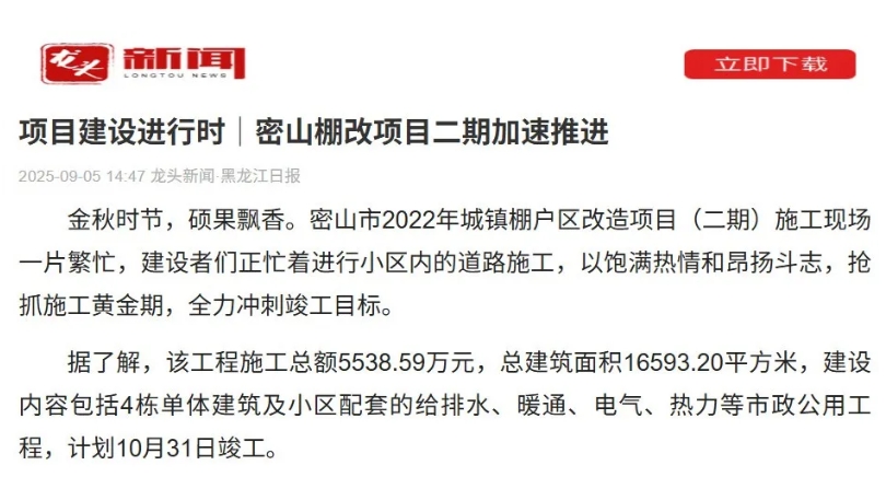 近日,龙头新闻·黑龙江日报以《项目建设进行时|密山棚改项目二期加速推进》为题,刊发了颜射 重点项目最新进展。原文如下: